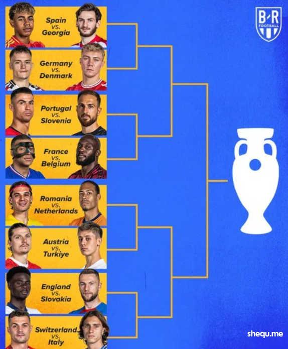 上半区:西班牙vs格鲁吉亚、德国vs丹麦、葡萄牙vs斯洛文尼亚、法国vs比利时;